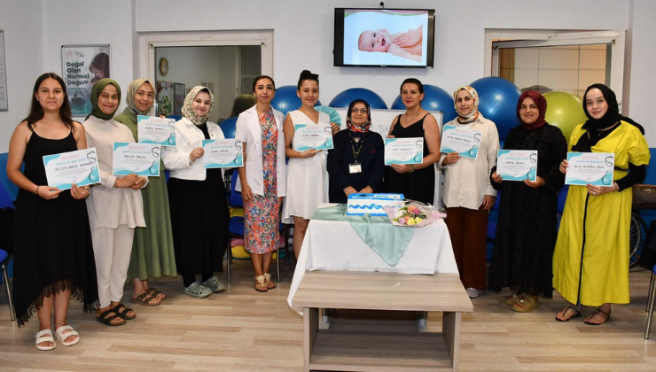 Gebe Okulu’nda 4 hafta boyunca derslere katılan ve bebek bakımı konusunda teorik ve uygulamalı eğitimlerini tamamlayan 13 anne adayına, düzenlenen törenle birlikte katılım belgeleri takdim edildi.