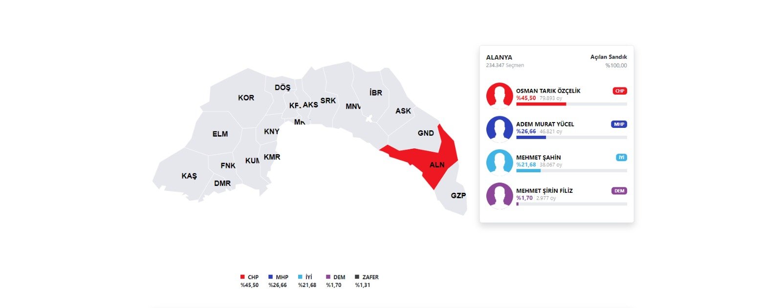 Belediye Meclisi Üyeliği, Büyükşehir Belediye Başkanlığı ve Alanya Belediye Başkanlığı oy sonuçlarına göre, CHP zafere ulaştı. Kent genelindeki mahallelerden gelen oylar, CHP’nin Alanya’daki gücünü bir kez daha kanıtladı.