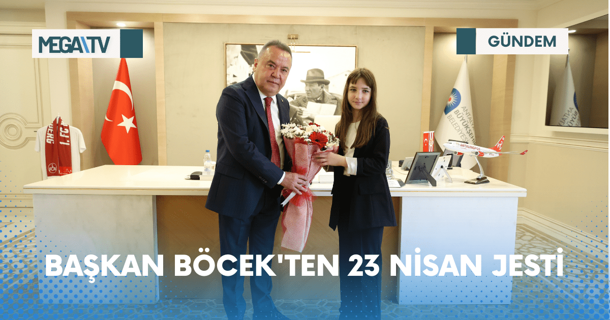 Antalya Büyükşehir Belediye Başkanı Muhittin Böcek, 23 Nisan Ulusal Egemenlik ve Çocuk Bayramı kutlamaları kapsamında koltuğunu Yüzbaşı Mustafa Ertuğrul İlkokulu 4. Sınıf öğrencisi Raziye Rana Çelebi’ye devretti. Çocuk Başkan Çelebi, yeşil alanların korunması ve arttırlması için talimat verdi.