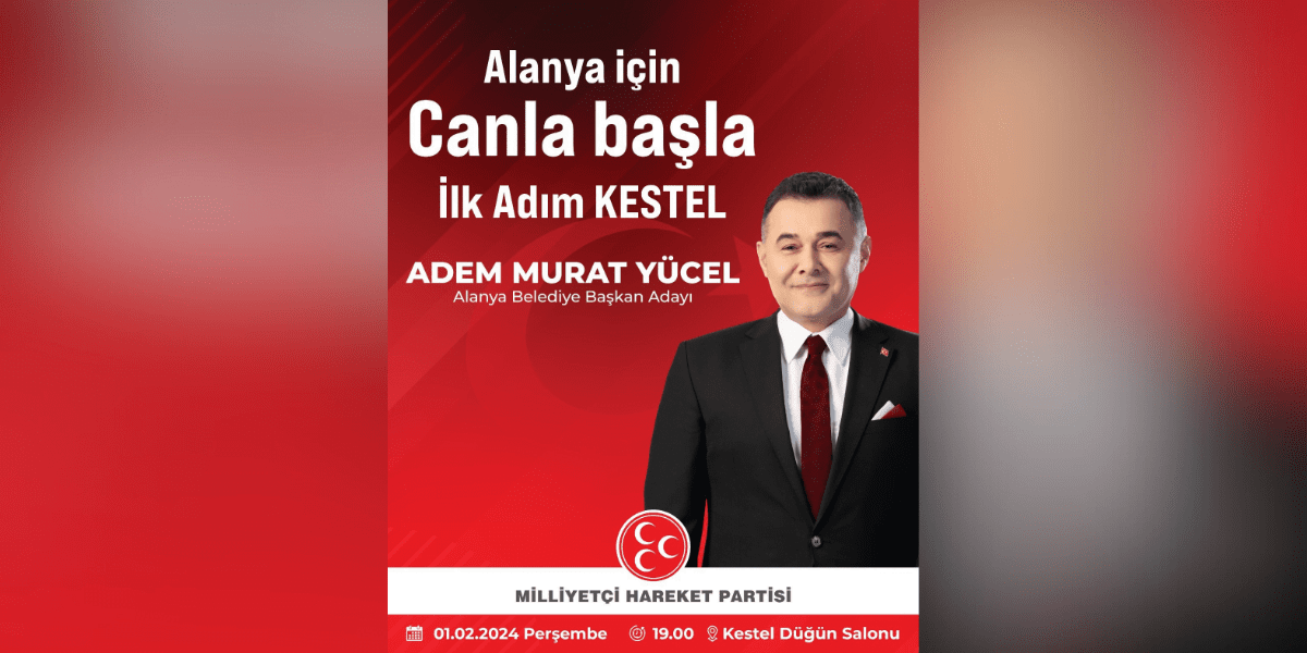 Alanya Belediye Başkanı ve Cumhur İttifakı Belediye Başkan Adayı Adem Murat Yücel, bütün vatandaşları Kestel Düğün Salonu’ndaki etkinliğe davet ederek şu ifadeleri kullandı; “Göreve geldiğimiz günden bu yana hep söylüyoruz; Bizim için en büyük hizmet gönüller almaktır, gönüllere girmektir, vatandaşımızın yüzünü güldürebilmektir. Bu uğurda çıkmış olduğumuz yolda ilk mahalle buluşmamızı baba ocağım Kestel Mahalle’mizde gerçekleştireceğiz. Tüm Alanyalıları 1 Şubat Perşembe günü saat 19.00’da Kestel Düğün Salonu’na davet ediyorum.”
