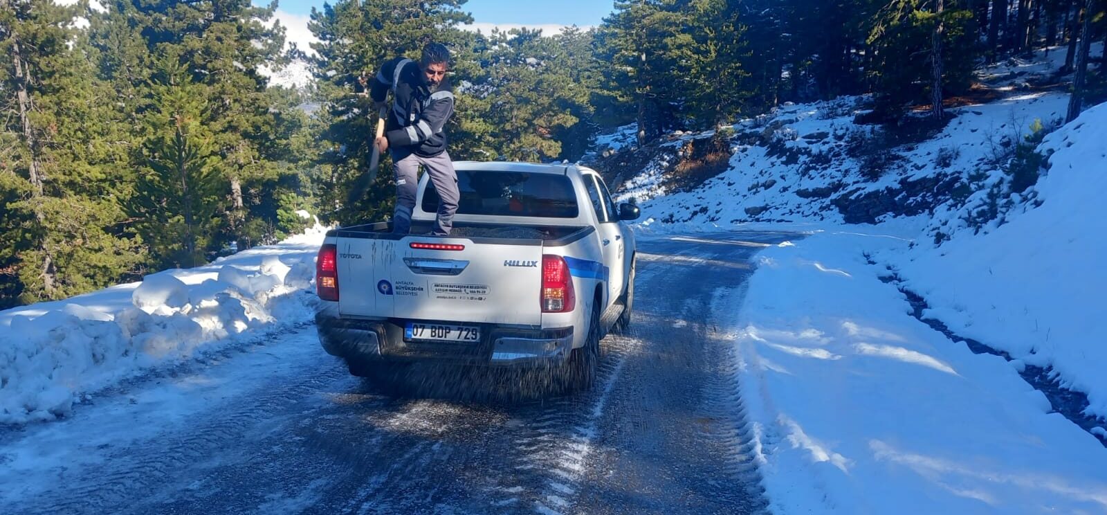 Antalya Büyükşehir Belediyesi ekipleri Alanya’da ulaşımın aksamaması aralıksız çalışıyor. Ekipler, Taşatan yolunda tuzlama çalışması yapıyor.