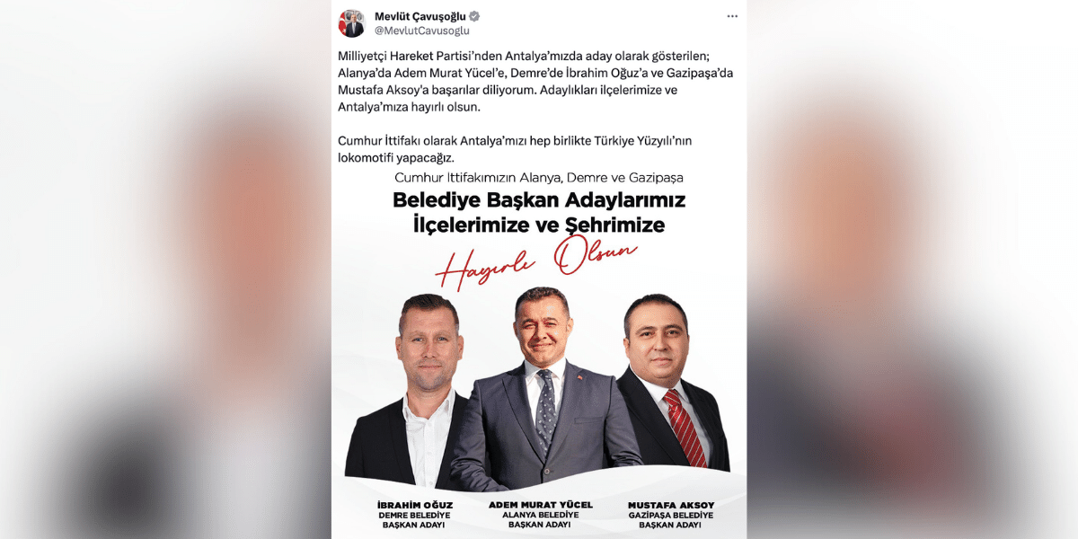 Önceki dönem Dışişleri Bakanı, AK Parti Antalya Milletvekili Mevlüt Çavuşoğlu, Cumhur İttifakı’nın Antalya’da açıkladığı adayları sosyal medyadan tebrik etti. Çavuşoğlu…