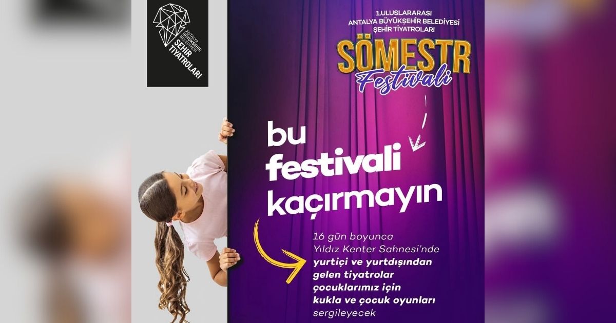 Çocukların sanatla dolu bir sömestr tatili geçirmesi için Antalya Büyükşehir Belediyesi Şehir Tiyatroları (AŞT) tarafından düzenlenen 1. Uluslararası Sömestr Festivali, 20 Ocak – 3 Şubat tarihleri arasında Yıldız Kenter Sahnesi’nde 13.00 ve 15.00 olmak üzere iki seansta düzenlenecek. 15 gün sürecek festival boyunca Antalya Büyükşehir Belediyesi Şehir Tiyatroları 4 farklı çocuk oyunu sahneleyecek. Festival biletleri www.ast.gov.tr üzerinden 20 TL’ye temin edilebilecek.