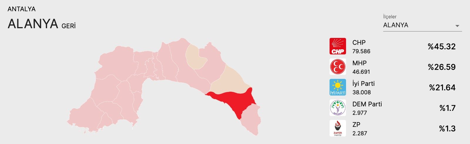 Alanya’da yapılan yerel seçimlerin ardından belediye meclis üyeleri belirlendi. Çeşitli siyasi partilerden adaylar meclise girmeye hak kazandı. Mecliste %43,7 oy oranıyla CHP üstünlüğü hakimken; MHP %26,7 ve İYİ Parti %18 oy oranıyla mecliste yer aldı.